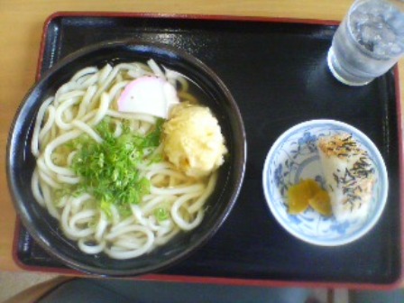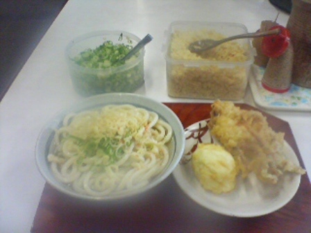 うどん2玉に、卵の天ぷら、ゲソ天をつけ、テーブルに備え付けの天かすとネギをたっぷり入れて食った。